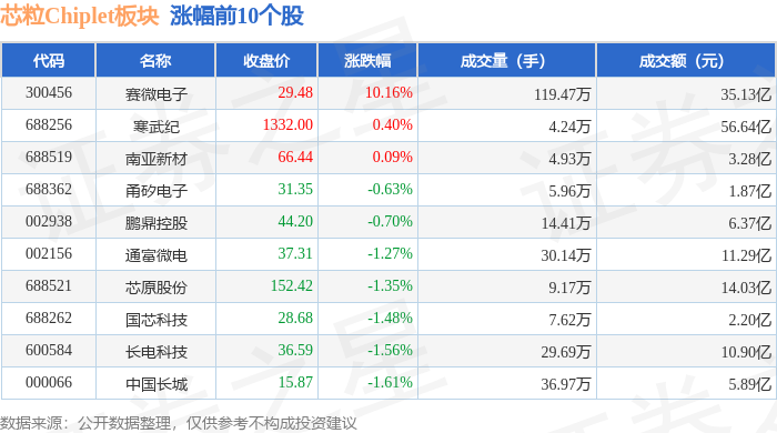 证券之星消息,11月19日芯粒Chiplet板块较上一交易日下跌0.38%,正业科技领跌。当日上证指数报收于3946.74,上涨0.18%。深证成指报收于13080.09,下跌0.0%。芯粒Chiplet板块个股涨跌见下表: