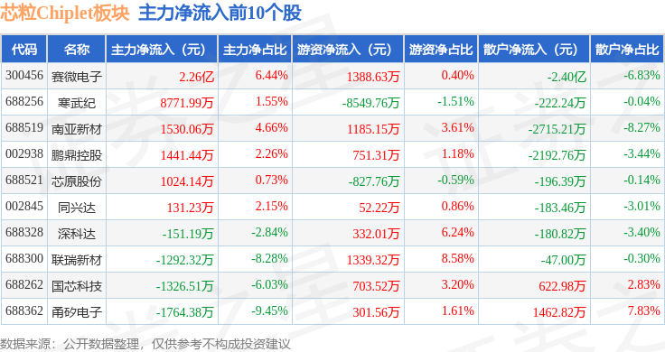 从资金流向上来看,当日芯粒Chiplet板块主力资金净流出3.7亿元,游资资金净流出1629.92万元,散户资金净流入3.86亿元。芯粒Chiplet板块个股资金流向见下表: