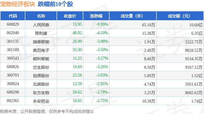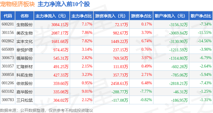 从资金流向上来看,当日宠物经济板块主力资金净流出6.36亿元,游资资金净流入1.94亿元,散户资金净流入4.42亿元。宠物经济板块个股资金流向见下表: