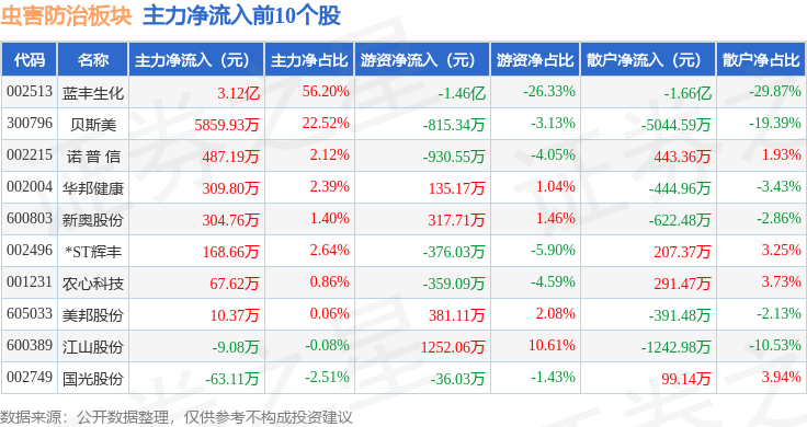 从资金流向上来看,当日虫害防治板块主力资金净流入1.33亿元,游资资金净流出1.47亿元,散户资金净流入1448.53万元。虫害防治板块个股资金流向见下表: