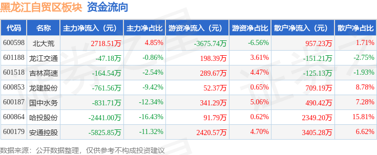 从资金流向上来看,当日黑龙江自贸区板块主力资金净流出7353.32万元,游资资金净流出281.65万元,散户资金净流入7634.97万元。黑龙江自贸区板块个股资金流向见下表: