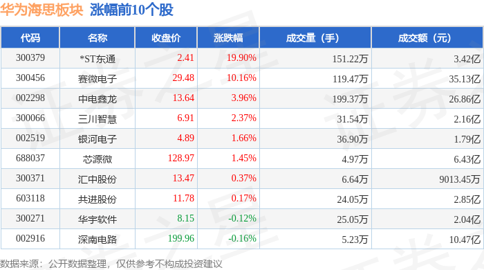 证券之星消息,11月19日华为海思板块较上一交易日下跌1.35%,好上好领跌。当日上证指数报收于3946.74,上涨0.18%。深证成指报收于13080.09,下跌0.0%。华为海思板块个股涨跌见下表: