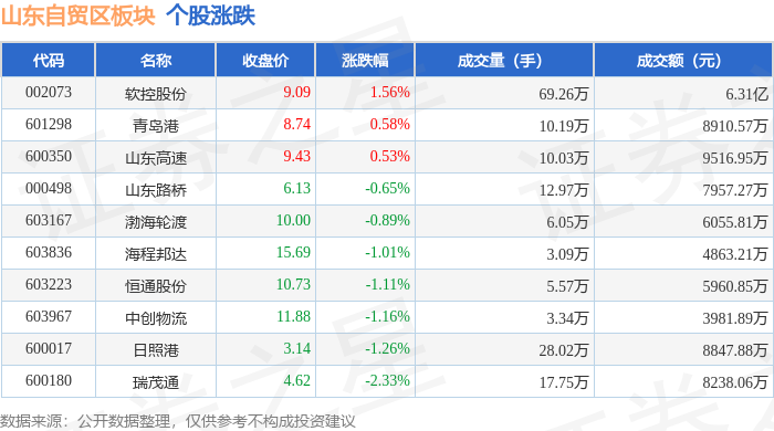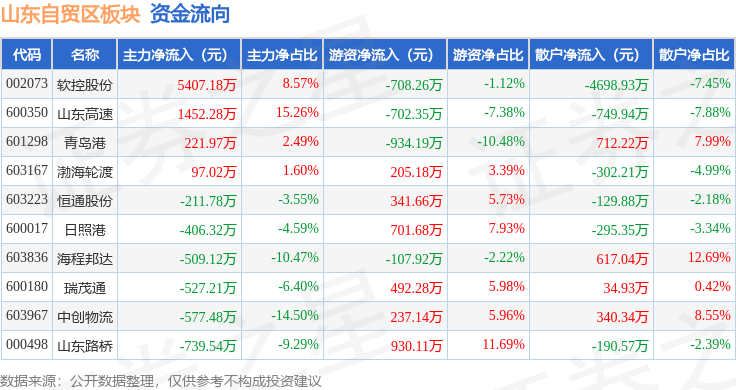 从资金流向上来看,当日山东自贸区板块主力资金净流入4207.01万元,游资资金净流入455.33万元,散户资金净流出4662.34万元。山东自贸区板块个股资金流向见下表: