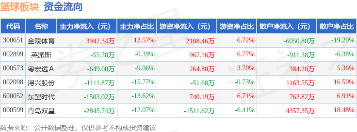 从资金流向上来看,当日篮球板块主力资金净流出2223.06万元,游资资金净流入2517.33万元,散户资金净流出294.26万元。篮球板块个股资金流向见下表: