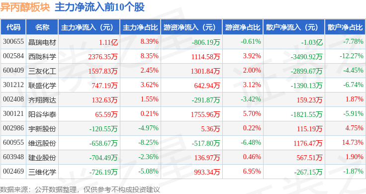从资金流向上来看,当日异丙醇板块主力资金净流入6005.0万元,游资资金净流入1.12亿元,散户资金净流出1.72亿元。异丙醇板块个股资金流向见下表: