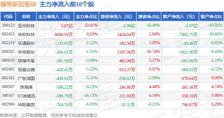 从资金流向上来看,当日横琴新区板块主力资金净流入3.16亿元,游资资金净流出2.18亿元,散户资金净流出9789.08万元。横琴新区板块个股资金流向见下表: