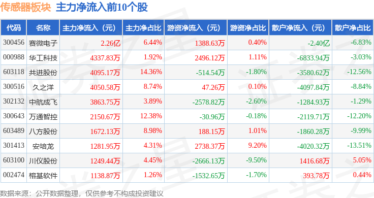 从资金流向上来看,当日传感器板块主力资金净流出24.31亿元,游资资金净流入4.55亿元,散户资金净流入19.76亿元。传感器板块个股资金流向见下表: