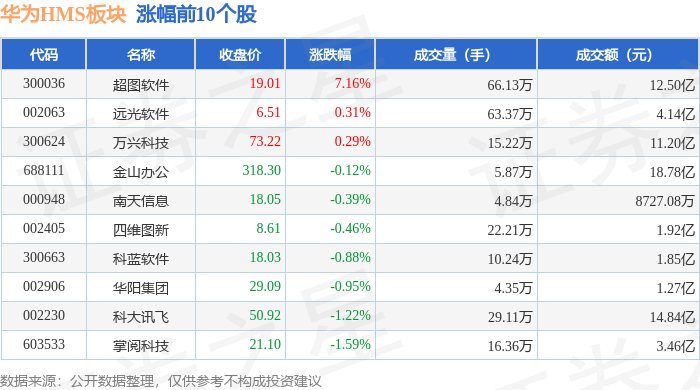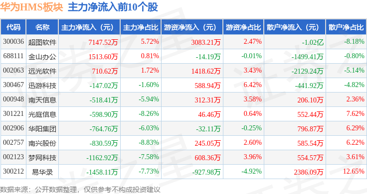 从资金流向上来看,当日华为HMS板块主力资金净流出7.46亿元,游资资金净流入1.96亿元,散户资金净流入5.5亿元。华为HMS板块个股资金流向见下表: