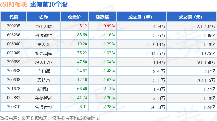 证券之星消息,11月19日eSIM板块较上一交易日下跌1.99%,福日电子领跌。当日上证指数报收于3946.74,上涨0.18%。深证成指报收于13080.09,下跌0.0%。eSIM板块个股涨跌见下表: