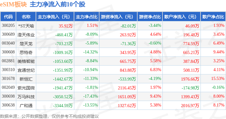 从资金流向上来看,当日eSIM板块主力资金净流出5.25亿元,游资资金净流入8307.53万元,散户资金净流入4.42亿元。eSIM板块个股资金流向见下表: