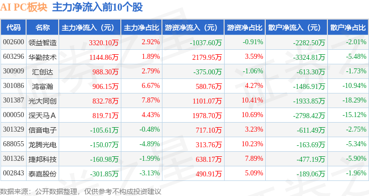 从资金流向上来看,当日AI PC板块主力资金净流出10.32亿元,游资资金净流入1.14亿元,散户资金净流入9.18亿元。AI PC板块个股资金流向见下表: