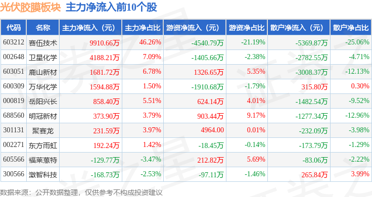 从资金流向上来看,当日光伏胶膜板块主力资金净流出2.93亿元,游资资金净流入43.04万元,散户资金净流入2.93亿元。光伏胶膜板块个股资金流向见下表: