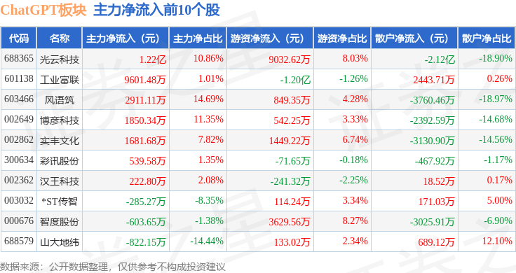从资金流向上来看,当日ChatGPT板块主力资金净流出17.89亿元,游资资金净流入5.57亿元,散户资金净流入12.32亿元。ChatGPT板块个股资金流向见下表: