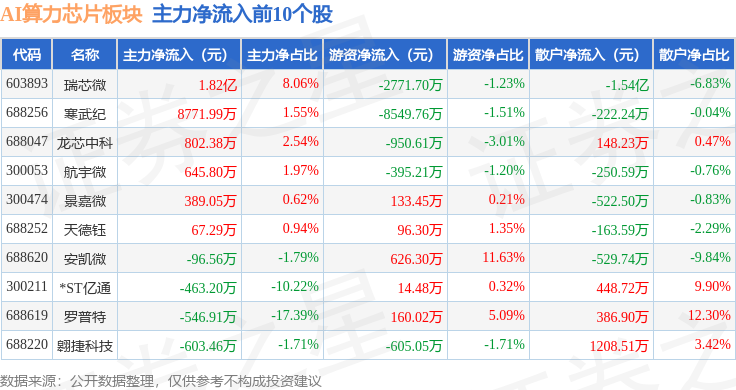 从资金流向上来看,当日AI算力芯片板块主力资金净流出6.71亿元,游资资金净流入2.21亿元,散户资金净流入4.5亿元。AI算力芯片板块个股资金流向见下表: