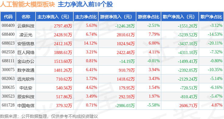 从资金流向上来看,当日人工智能大模型板块主力资金净流出48.17亿元,游资资金净流入14.96亿元,散户资金净流入33.21亿元。人工智能大模型板块个股资金流向见下表: