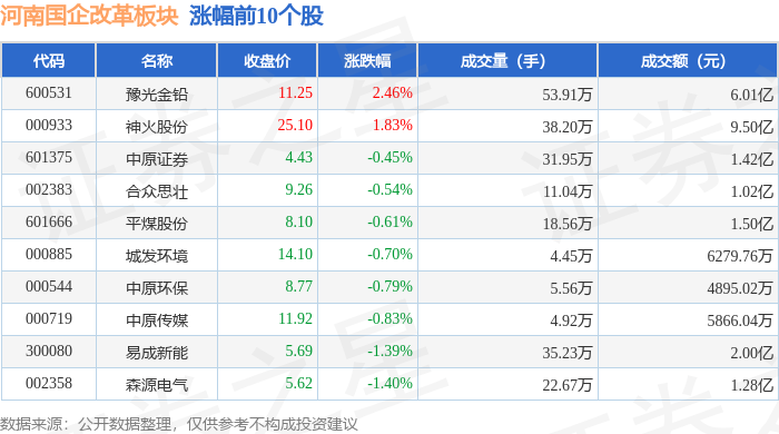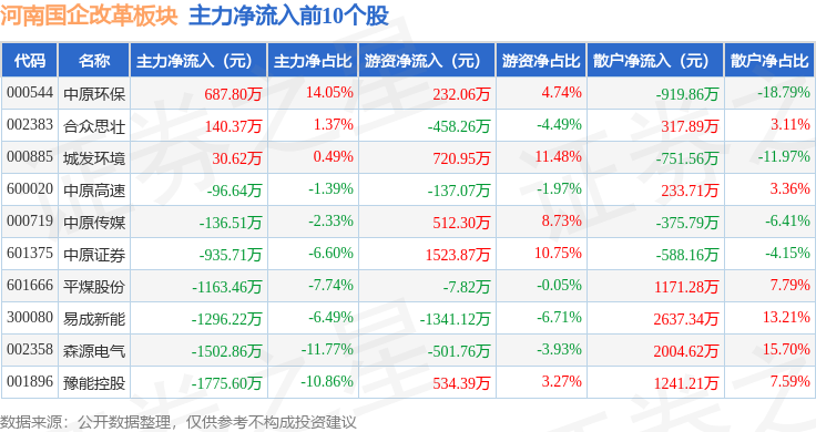 从资金流向上来看,当日河南国企改革板块主力资金净流出4.9亿元,游资资金净流出5219.14万元,散户资金净流入5.42亿元。河南国企改革板块个股资金流向见下表: