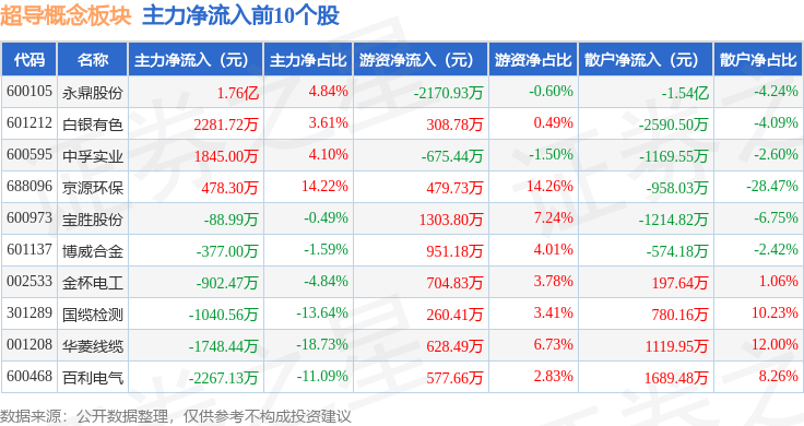 从资金流向上来看,当日超导概念板块主力资金净流出2.52亿元,游资资金净流入8527.63万元,散户资金净流入1.66亿元。超导概念板块个股资金流向见下表: