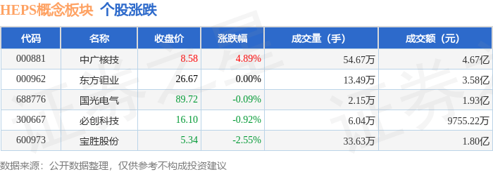 证券之星消息,11月19日HEPS概念板块较上一交易日上涨0.27%,中广核技领涨。当日上证指数报收于3946.74,上涨0.18%。深证成指报收于13080.09,下跌0.0%。HEPS概念板块个股涨跌见下表: