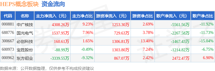 从资金流向上来看,当日HEPS概念板块主力资金净流入2578.3万元,游资资金净流入5460.62万元,散户资金净流出8038.91万元。HEPS概念板块个股资金流向见下表: