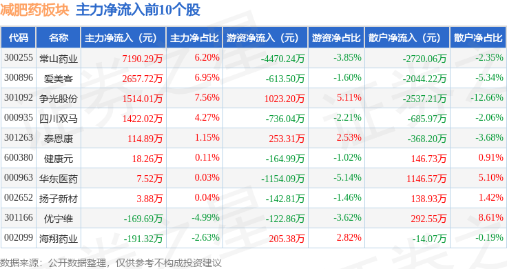 从资金流向上来看,当日减肥药板块主力资金净流出9.36亿元,游资资金净流出7892.43万元,散户资金净流入10.15亿元。减肥药板块个股资金流向见下表: