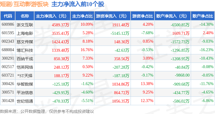 从资金流向上来看,当日短剧/互动影游板块主力资金净流出16.86亿元,游资资金净流入2.41亿元,散户资金净流入14.46亿元。短剧/互动影游板块个股资金流向见下表: