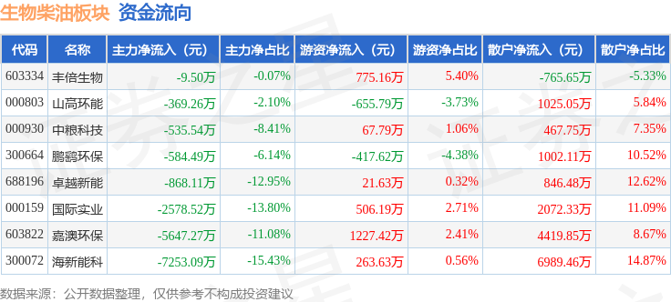 从资金流向上来看,当日生物柴油板块主力资金净流出1.78亿元,游资资金净流入1788.41万元,散户资金净流入1.61亿元。生物柴油板块个股资金流向见下表: