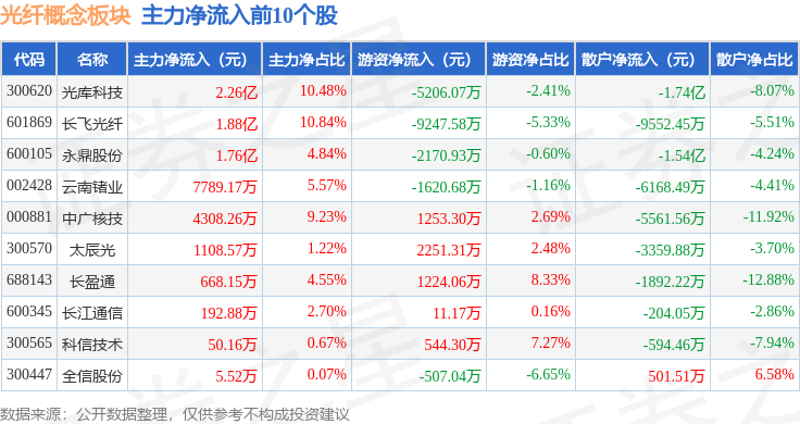 从资金流向上来看,当日光纤概念板块主力资金净流入2.51亿元,游资资金净流出8635.14万元,散户资金净流出1.64亿元。光纤概念板块个股资金流向见下表:
