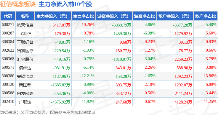 从资金流向上来看,当日征信概念板块主力资金净流出3.12亿元,游资资金净流入3483.87万元,散户资金净流入2.77亿元。征信概念板块个股资金流向见下表: