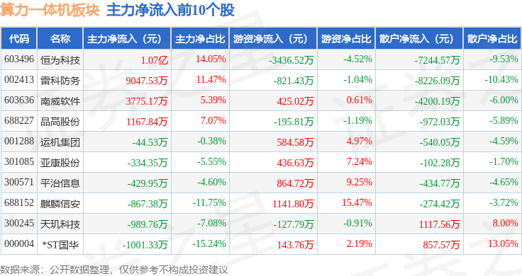 从资金流向上来看,当日算力一体机板块主力资金净流出21.84亿元,游资资金净流入4.75亿元,散户资金净流入17.08亿元。算力一体机板块个股资金流向见下表: