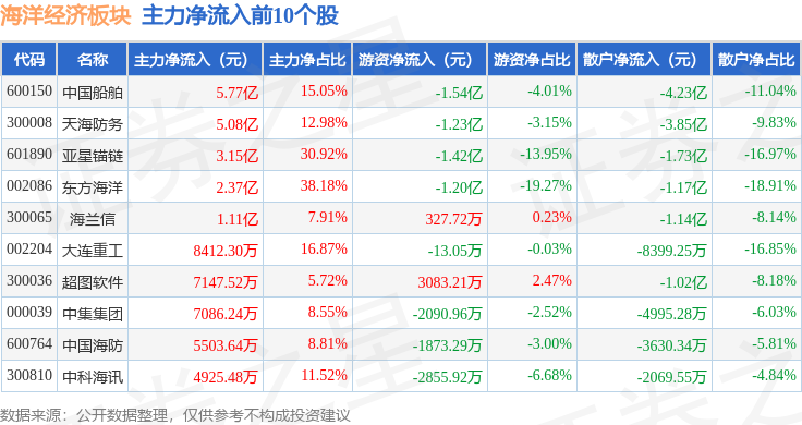 从资金流向上来看,当日海洋经济板块主力资金净流入13.68亿元,游资资金净流出5.26亿元,散户资金净流出8.42亿元。海洋经济板块个股资金流向见下表: