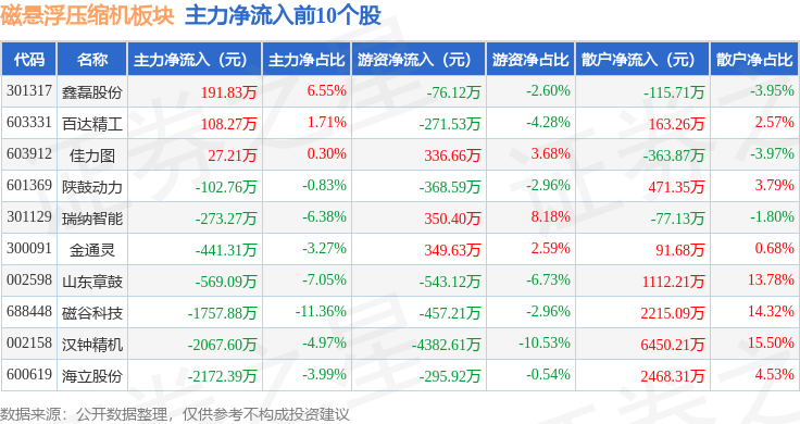从资金流向上来看,当日磁悬浮压缩机板块主力资金净流出2.42亿元,游资资金净流入411.26万元,散户资金净流入2.38亿元。磁悬浮压缩机板块个股资金流向见下表:
