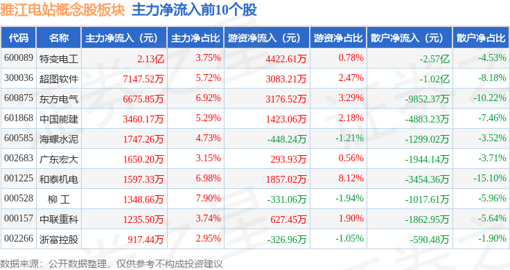 从资金流向上来看,当日雅江电站概念股板块主力资金净流出7.57亿元,游资资金净流入2.58亿元,散户资金净流入4.99亿元。雅江电站概念股板块个股资金流向见下表: