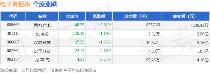 证券之星消息,11月19日电子鼻板块较上一交易日下跌1.53%,报 喜 鸟领跌。当日上证指数报收于3946.74,上涨0.18%。深证成指报收于13080.09,下跌0.0%。电子鼻板块个股涨跌见下表: