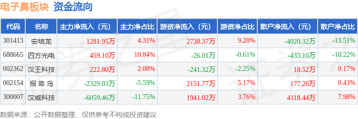 从资金流向上来看,当日电子鼻板块主力资金净流出6424.64万元,游资资金净流入6563.84万元,散户资金净流出139.2万元。电子鼻板块个股资金流向见下表: