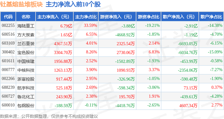 从资金流向上来看,当日钍基熔盐堆板块主力资金净流入3.12亿元,游资资金净流出4.33亿元,散户资金净流入1.21亿元。钍基熔盐堆板块个股资金流向见下表: