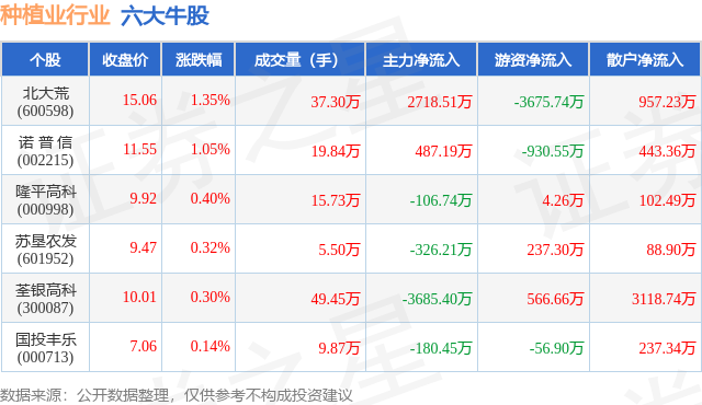 个股表现方面,种植业行业当日领涨股为北大荒(600598),该股当日报收15.06,上涨1.35%,成交量37.3万,主力资金净流入2718.51万元。诺 普 信(002215)以上涨1.05%紧随其后,该股当日成交量19.84万,主力资金净流入487.19万元。除此之外,隆平高科(000998)、苏垦农发(601952)、荃银高科(300087)均进入当日牛股之列。具体个股列表见下表: