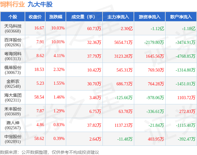 个股表现方面,饲料行业当日领涨股为天马科技(603668),该股当日报收16.67,上涨10.03%,成交量60.73万,主力资金净流入2.3亿元。百洋股份(002696)以上涨10.01%紧随其后,该股当日成交量32.36万,主力资金净流入5654.71万元。除此之外,粤海饲料(001313)、佩蒂股份(300673)、金新农(002548)均进入当日牛股之列。具体个股列表见下表: