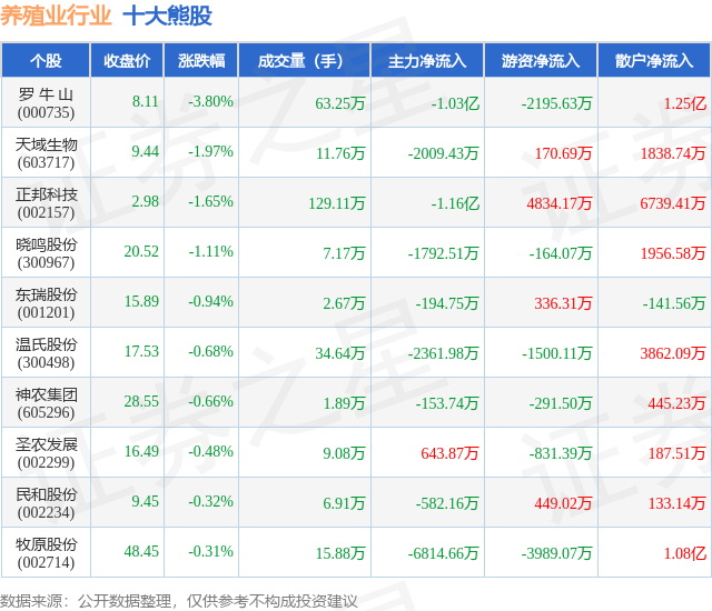 个股表现方面,养殖业行业当日领跌股为罗 牛 山(000735),该股当日报收8.11,下跌3.8%,成交量63.25万,主力资金净流出1.03亿元。天域生物(603717)以下跌1.97%紧随其后,该股当日成交量11.76万,主力资金净流出2009.43万元。除此之外,正邦科技(002157)、晓鸣股份(300967)、东瑞股份(001201)均进入当日熊股之列。具体个股列表见下表: