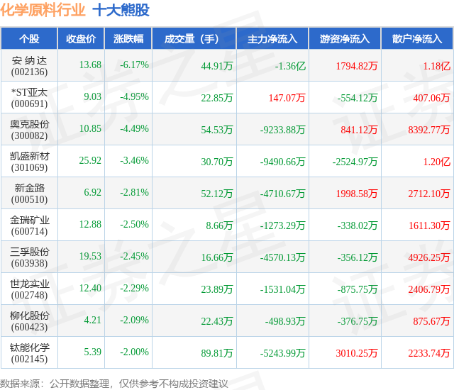 个股表现方面,化学原料行业当日领跌股为安 纳 达(002136),该股当日报收13.68,下跌6.17%,成交量44.91万,主力资金净流出1.36亿元。*ST亚太(000691)以下跌4.95%紧随其后,该股当日成交量22.85万,主力资金净流入147.07万元。除此之外,奥克股份(300082)、凯盛新材(301069)、新金路(000510)均进入当日熊股之列。具体个股列表见下表: