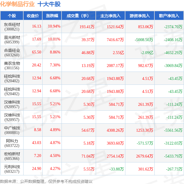 个股表现方面,化学制品行业当日领涨股为东岳硅材(300821),该股当日报收16.13,上涨10.94%,成交量193.41万,主力资金净流入1521.64万元。晨光新材(605399)以上涨10.01%紧随其后,该股当日成交量39.37万,主力资金净流入7416.67万元。除此之外,合盛硅业(603260)、美农生物(301156)、硅烷科技(920402)均进入当日牛股之列。具体个股列表见下表: