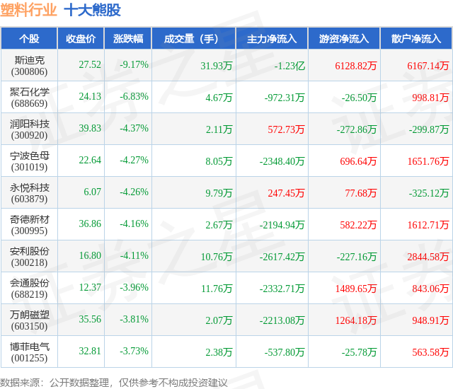 个股表现方面,塑料行业当日领跌股为斯迪克(300806),该股当日报收27.52,下跌9.17%,成交量31.93万,主力资金净流出1.23亿元。聚石化学(688669)以下跌6.83%紧随其后,该股当日成交量4.67万,主力资金净流出972.31万元。除此之外,润阳科技(300920)、宁波色母(301019)、永悦科技(603879)均进入当日熊股之列。具体个股列表见下表: