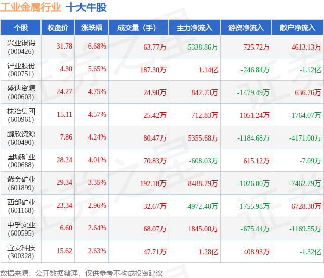 个股表现方面,工业金属行业当日领涨股为兴业银锡(000426),该股当日报收31.78,上涨6.68%,成交量63.77万,主力资金净流出5338.86万元。锌业股份(000751)以上涨5.65%紧随其后,该股当日成交量187.3万,主力资金净流入1.14亿元。除此之外,盛达资源(000603)、株冶集团(600961)、鹏欣资源(600490)均进入当日牛股之列。具体个股列表见下表: