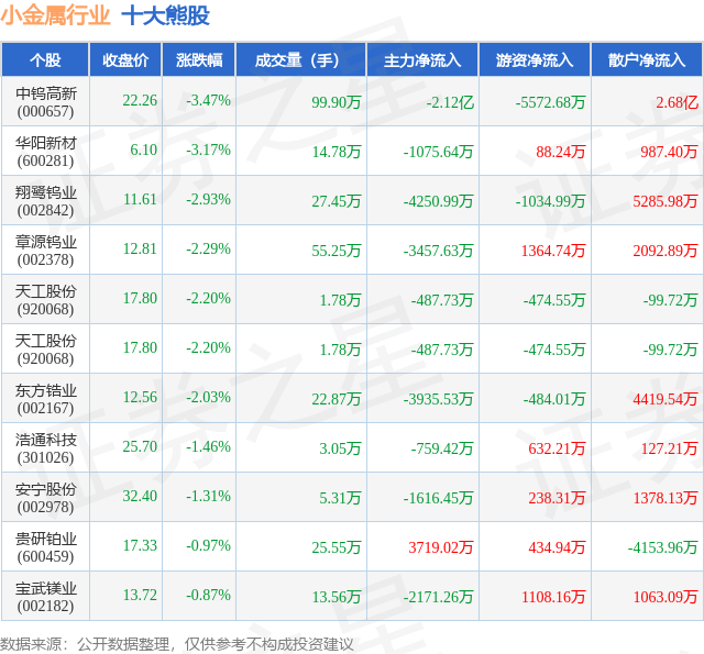 个股表现方面,小金属行业当日领跌股为中钨高新(000657),该股当日报收22.26,下跌3.47%,成交量99.9万,主力资金净流出2.12亿元。华阳新材(600281)以下跌3.17%紧随其后,该股当日成交量14.78万,主力资金净流出1075.64万元。除此之外,翔鹭钨业(002842)、章源钨业(002378)、天工股份(920068)均进入当日熊股之列。具体个股列表见下表: