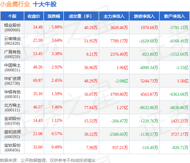个股表现方面,小金属行业当日领涨股为锡业股份(000960),该股当日报收24.48,上涨5.88%,成交量40.29万,主力资金净流入3820.46万元。云南锗业(002428)以上涨3.64%紧随其后,该股当日成交量51.95万,主力资金净流入7789.17万元。除此之外,广晟有色(600259)、中国稀土(000831)、中矿资源(002738)均进入当日牛股之列。具体个股列表见下表:
