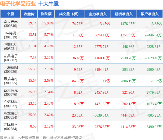 个股表现方面,电子化学品行业当日领涨股为南大光电(300346),该股当日报收39.44,上涨5.85%,成交量74.72万,主力资金净流入3.47亿元。唯特偶(301319)以上涨5.79%紧随其后,该股当日成交量11.92万,主力资金净流入6094.11万元。除此之外,格林达(603931)、宏昌电子(603002)、上海新阳(300236)均进入当日牛股之列。具体个股列表见下表: