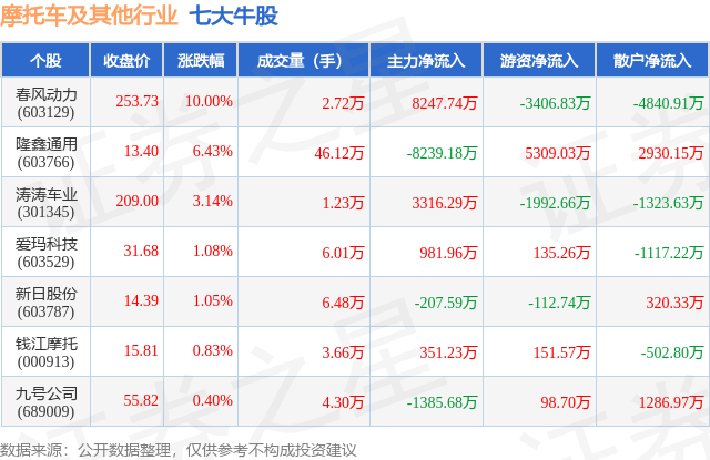 个股表现方面,摩托车及其他行业当日领涨股为春风动力(603129),该股当日报收253.73,上涨10.0%,成交量2.72万,主力资金净流入8247.74万元。隆鑫通用(603766)以上涨6.43%紧随其后,该股当日成交量46.12万,主力资金净流出8239.18万元。除此之外,涛涛车业(301345)、爱玛科技(603529)、新日股份(603787)均进入当日牛股之列。具体个股列表见下表: