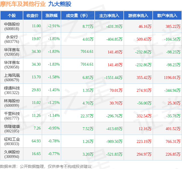 个股表现方面,摩托车及其他行业当日领跌股为中路股份(600818),该股当日报收11.0,下跌2.91%,成交量8.77万,主力资金净流出431.39万元。永安行(603776)以下跌1.85%紧随其后,该股当日成交量4.03万,主力资金净流出404.85万元。除此之外,华洋赛车(920058)、华洋赛车(920058)、上海凤凰(600679)均进入当日熊股之列。具体个股列表见下表: