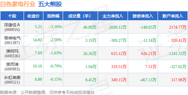 个股表现方面,白色家电行业当日领跌股为深康佳A(000016),该股当日报收5.21,下跌3.16%,成交量46.89万,主力资金净流出2026.12万元。雪祺电气(001387)以下跌2.5%紧随其后,该股当日成交量3.19万,主力资金净流出309.27万元。除此之外,澳柯玛(600336)、惠而浦(600983)、长虹美菱(000521)均进入当日熊股之列。具体个股列表见下表: