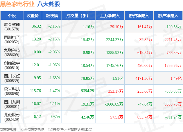 个股表现方面,黑色家电行业当日领跌股为辰奕智能(301578),该股当日报收36.32,下跌2.16%,成交量1.16万,主力资金净流入29.1万元。同洲电子(002052)以下跌2.15%紧随其后,该股当日成交量15.42万,主力资金净流出2244.27万元。除此之外,九联科技(688609)、创维数字(000810)、四川长虹(600839)均进入当日熊股之列。具体个股列表见下表: