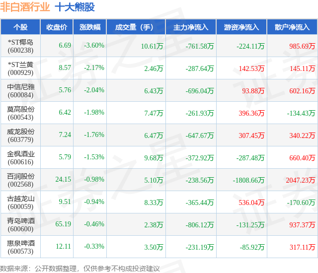个股表现方面,非白酒行业当日领跌股为*ST椰岛(600238),该股当日报收6.69,下跌3.6%,成交量10.61万,主力资金净流出761.58万元。*ST兰黄(000929)以下跌2.17%紧随其后,该股当日成交量2.46万,主力资金净流出287.64万元。除此之外,中信尼雅(600084)、莫高股份(600543)、威龙股份(603779)均进入当日熊股之列。具体个股列表见下表: